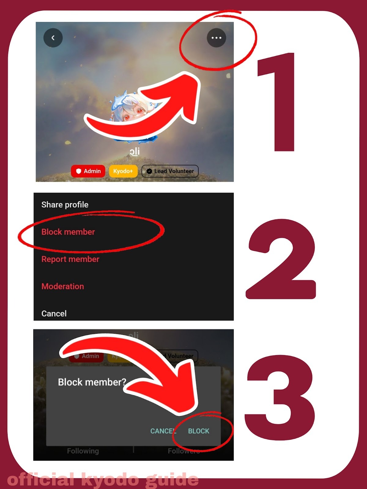 Click on the 3 dots on the top right corner of the user's profile. Scroll until you see "Block member". A pop-up will appear to ask if you are sure you want to block them, click "BLOCK".